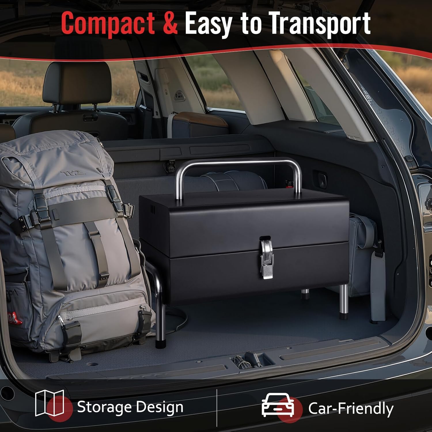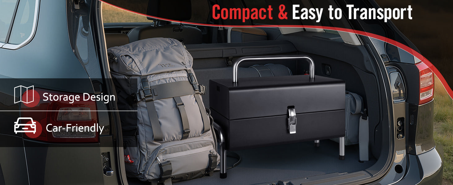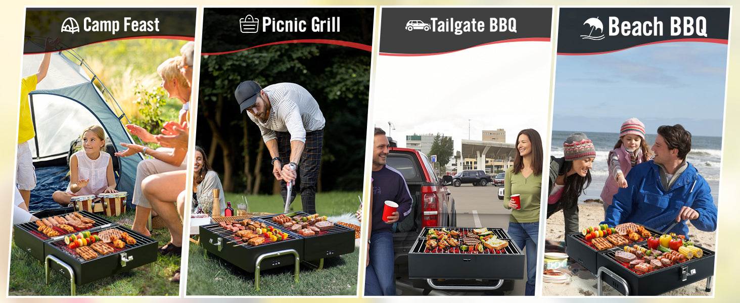 - 【Secure Metal Handle for Easy Transport】The installed metal handle allows one-handed carrying, making it effortless to take this grill camping, to the beach, or backyard. Sleek black finish resists scratches. Ready to cook in seconds after setup.