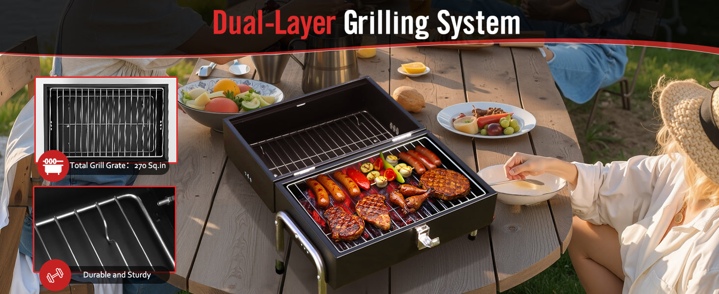 Portable Charcoal Grill, Table Top Small BBQ Grill For Outdoor, Camping, Beach, Easy Assembly, Heavy Duty & Multi-Use Small Grill, Black (270 Sq.In)